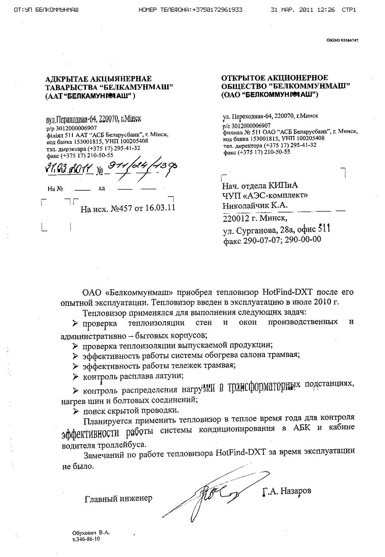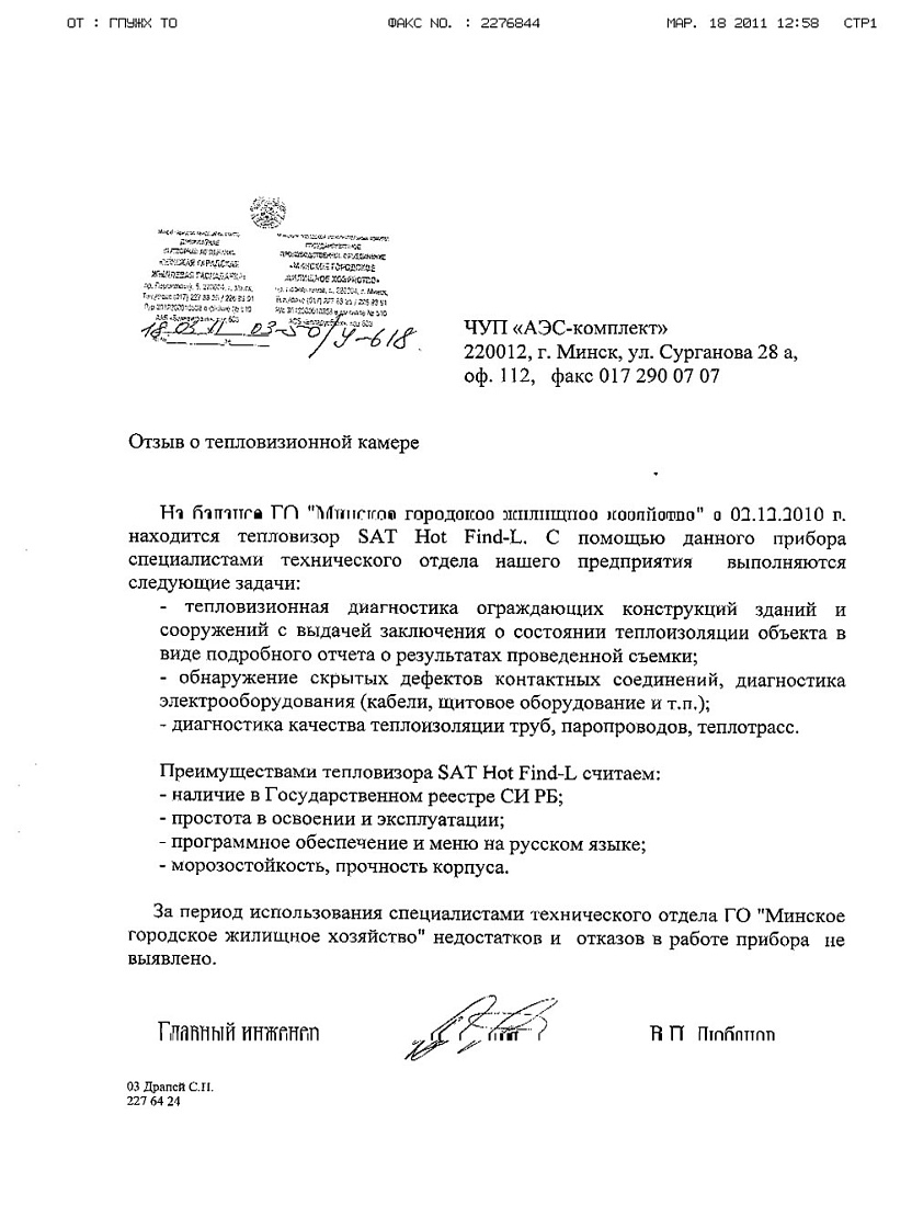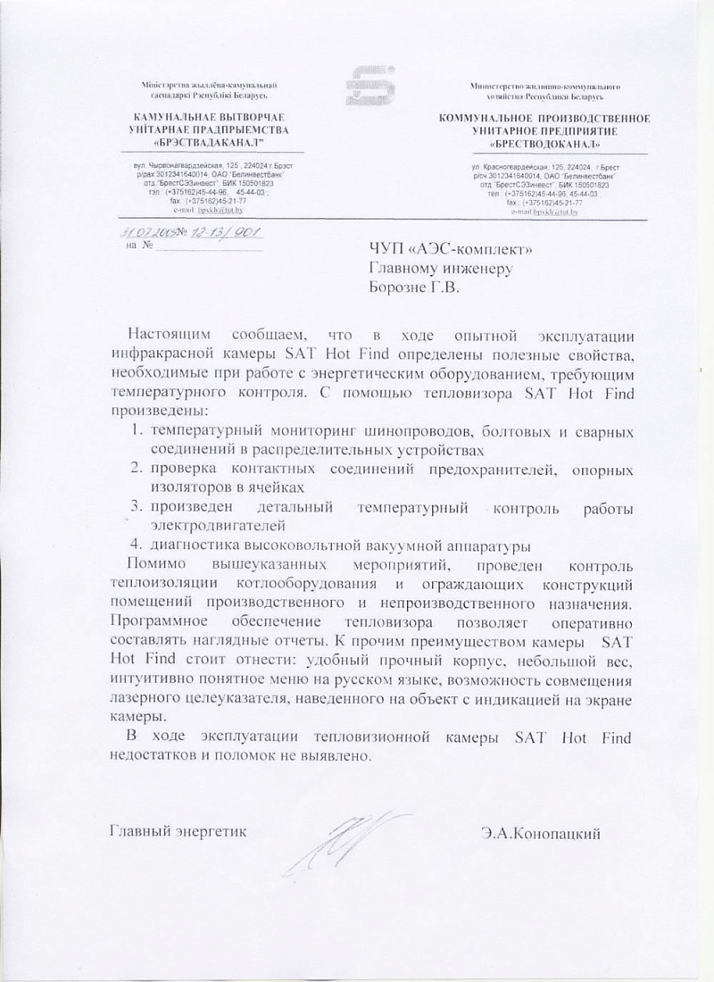 Всего на предприятиях промышленности и энергетики используется более 20 камер SAT HotFind-L, среди наших клиентов РУП "Гомельэнерго" (ПЭС), филиал РУП "Могилевэнерго" Бобруйские ЭС, Минское городское жилищное хозяйство, ОУПП "Гродненское городское жилищное хозяйство", Могилевское отделение Белорусской железной дороги Могилевское локомотивное депо, УП "Минсккоммунтеплосеть", СООО "Алюминтехно" и др.Ознакомиться со всеми отзывами на представленное оборудование Вы можете в разделе "Документация".