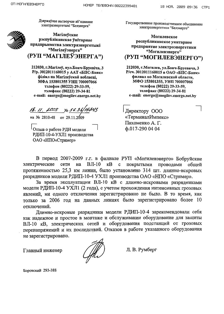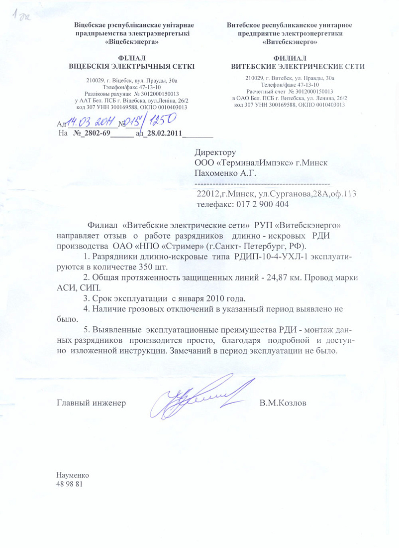 Разрядники РДИП широко применяются во многих энергосистемах России в соответствии с Решением Научно — Технического Совета «РАО ЕЭС России» и «Методическими указаниями по защите распределительных электрических сетей напряжением 0,4-10 кВ от грозовых перенапряжений». Применение длинно-искровых разрядников РДИ, разработанных ОАО «НПО «Стример», признано перспективным Постановлением Научно — Технического Совета РАО «ЕЭС России» от 24.03.00.